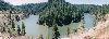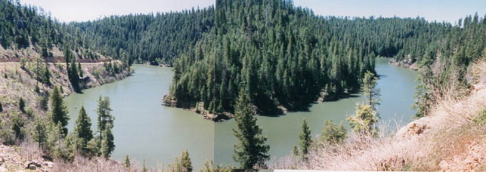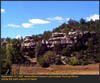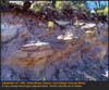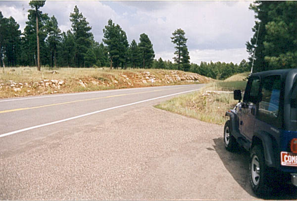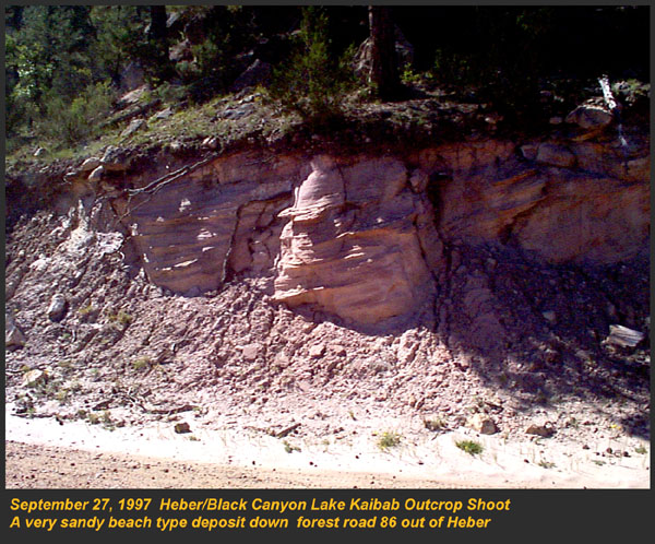 Covering most of Northern Arizona from the south edge of the Mogollon Rim to the highlands north of Flagstaff, the Permian Kaibab Limestone is part of the Kaibab Formation, which includes sandstones, shales, mud stones and dolomites. The Kaibab is 260 to 255 million years old, and is perched on the Coconino and Toroweap sandstones. We have found much of the limestone is really dolomite, and much of the fossiliferous type is fetid. (produces a petroleum like odor when struck with a rock pick) The Kaibab contains two basic members, the upper Harrisburg member which consists of the older alpha member, and the lower Fossil Mountain member which is derived from the older terminology beta and gamma members. The lithology of each is distinctly different, the Fossil Mountain occurring on the southern edge of the Mogollon Rim, and contains mostly productid brachiopods, burrows of callanassid shrimp, and hexactanellid sponges. The upper Harrisburg member is highly dolomitic, and contains fossils of clams, cephlopods, and brachiopods. CLICK ON THE FOLLOWING SELECTIONS FOR A LARGER VIEW: A very scenic panorama of Blue Ridge reservoir, a very good outcrop of the Kaibab Fossil Mountain member. The lake itself is a manmade affair, complete with a boat launch and fish. Examination of the lithology of the area is made much easier by the fine road that cuts through the outcrop, along the lake. We have collected both molluscs, productids, trilobites and sponges at this site, although it is only locally fossiliferous. Many of the best outcrops of the Fossil Mountain member can be found on the west end of Lake Mary Road up near Flagstaff. It was along this road we found several giant football sized nautiloids, trilobites, sponges, and a variety of brachiopods. The road itself also cuts through a great deal of basalt on the east end, with a bit of Triassic Moenkopi about in the middle. Numerous low cliffs of Fossil Mountain member Kaibab limestone can be found in the Rim town of Heber. Just north of town is a huge canyon, with many outcrops and exposures. Fossils include large numbers of sea urchin spines, sponges and productids. Another fine exposure just north of Heber, in the main canyon. Here we can see the more massive cliff forming material overlying a debris slope of softer less resistant material eroding away. Often the more resistant facies are composed of dolomite. Down Forest Road 86 out of Heber, we find a large number of unique isolated outcrops framed by numerous conifer trees. This exposure of the Fossil Mountain member shows differential weathering of the different levels from a pure white to a dark dingy gray color. This magnificent outcrop of Fossil Mountain member is down Forest Road 86 outside of Heber. Differential weathering seen here as a dark massive member, and a less resistant crumbling bed in between. We found brachiopod fossils at the base of the cliff, which appeared to originate from the less resistant beds. This is one of our favorite outcrops for its natural beauty. This road cut was found down Forest Road 86 just outside of Heber. It is unusual because the huge amount of pure white sand that was eroding out of the layers, which were strongly cross bedded, indicating a beach dune deposit or sand bar. The white sand was followed for hundreds of feet down the road which washed out during recent rains. This was a non fossiliferous unit of the Fossil Mountain member. A close up view of the above road cut, showing the bedding pattern in more detail. The individual slabs were extremely sandy, more of a very sandy limy shale, and pure white sand poured out as you broke the layers apart. Upon seeing the white beach sand in the road, I couldn't help but image the roaring ocean waves that were at one time at this location, and now, 285 million years later I was standing on the ancient sands, now totally silent. |