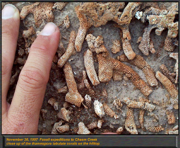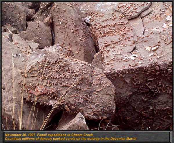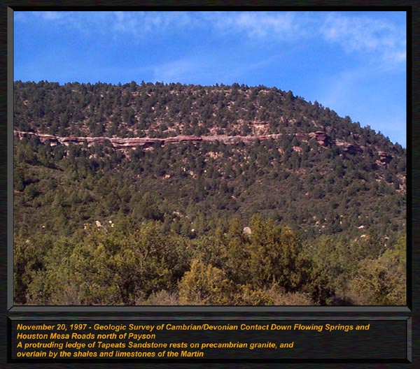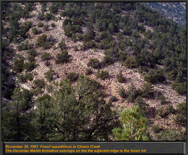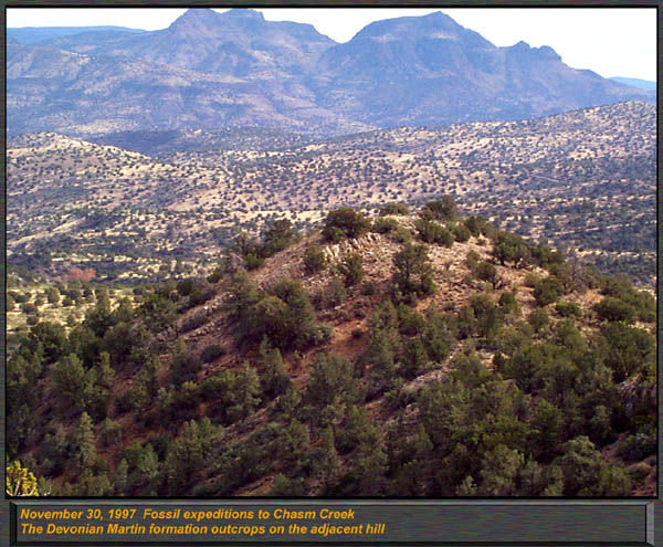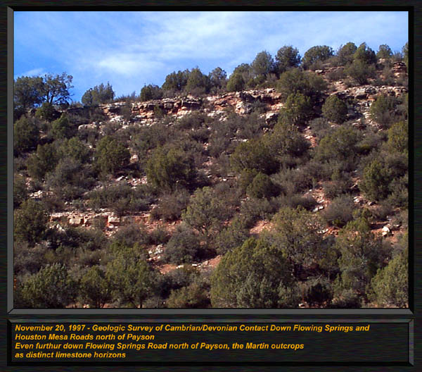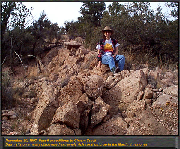 The Devonian Martin Formation outcrops in Northern Arizona, along the Mogollon Rim, and in South Eastern Arizona. 350 to 400 Million years in age, this formation has been renamed, reclassified and had its members by some elevated to formational status. For the most part, it is called the "Martin Formation" in northern and central Arizona, and in the southern parts of our state, the "Martin Limestone" Primarily a marine formation, the Martin has a single lower Beckers Butte member south of Globe and just north of Payson, which contains a primitive land plant locality, one of only a small handful of such occurrences in the entire world. In Northern and Central Arizona, the Martin formation contains the Jerome member (or IS the Jerome Formation, depending on what you read!) which is divided into three basic members. The lower member, was described by Teichert as the Fetid Dolomite member, characterized by the strong petroliferous odor (strong propane like odor) when struck or freshly broken with a hammer. It consists of a dark dolomitic limestone with few if any fossils. The Middle Member is a light gray highly aphanitic (ultra fine grained) dolomite. Sedimentary structures such as mud cracks, load casts, and intraformational conglomerate are common in this member, however fossils are very scarce as well. The upper member, contains various dolomites including fetid types, sandstones, and conglomerates, and sandy dolomite units. The upper member is highly fossiliferous, and contains a rich variety of corals, stromatoporoids, brachiopods and gastropods. Most are silicified, and can be easily removed by immersing in dilute muriatic acid. The Beckers Butte member does not occur in abundance in Northern Arizona, only as a basal unit in the central part of the state. Select one of the following thumbnails for a larger view (600 pixels in width) The Jerome member of the Martin Formation forms distinct ledges along Flowing Springs road just north of Payson. This is the upper member of the Jerome Formation, and alternates from cliff forming dolomites to less resistant slope forming shales. This image demonstrates the large unconformities in the Paleozoic sedimentary rocks down Flowing Springs Road, just north of Payson. The base of this ridge is 1.2 By Precambrian granite, overlain by a distinct protruding ledge of Precambrian Tapeats sandstone. The overlying dolomitic limestone is the Jerome Formation, upper member, and contains arthrodire fish material. Differential erosion accounts for this unique outcrops appearance down Houston Mesa road, just north of Payson.. Here, in the Jerome Formations upper member, this marker type lithology can be spotted over much of the Mogollon Rim. Just above this outcrop, we found a diversity of silicified corals, brachiopods and stromatoporoids. The fabulously rich and scenic outcrops of the Jerome formations upper member can be found near Camp Verde, Here, standing on top of a steep and 900 foot tall ridge, I overlooked an adjacent ridge, with angled strata forming the Devonian outcrop found here. Massive amounts of silicified corals and brachiopods can be found in this area, including the huge beachball sized globes of the Hexagonaria corals. This is an excellent image to demonstrate the common pinkish weathering found in the upper shales of the Jerome Formation. Note the sharp edges, and both thin and thick bedding. Shales of this type ring with a bell like tone when struck by a hammer. This locality, down Control Road 64, north of Payson had excellent Pachyphyllum Woodmani corals, which resemble the surface of the moon, with the coral calyces looking like lunar craters with raised rims! We also found many "brainstones", quartz geodes that have a pink outer color, and a lumpy brain like appearance. They are basically silicified evaporite nodules. Another excellent view of the dolomite bedding and thicker horizons of limey shales found near Camp Verde. This "aerial view" was from a tall adjacent ridge. Thamnopora tabulate corals are packed in at incredible densities . We found the preservation to be superb here, acid baths revealed perfectly articulated specimens of Aulopora, Hexagonaria, and large squat rugose corals in exquisite detail. The Limestones and limey shales contained large numbers of predominantly a tabulate coral known as Thamnopora. (Earlier publications called them "Cladopora") This beautiful branching coral formed huge colonies and sub reefs on the open sea floor. While this locality is not technically a reef, it is a rich assembly of low diversity shallow water fauna. ("Thatcoensis") My wife Dawn sits with a huge grin on a fabulously fossiliferous outcrop of the Jerome member. Thamnopora is common all the way from here through Jerome, to north of Payson. It is THE most common coral in the Martin formation in northern Arizona. |
