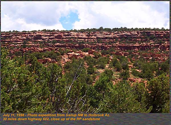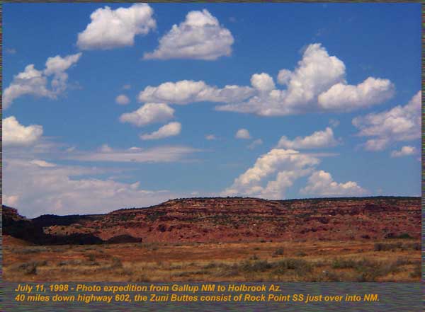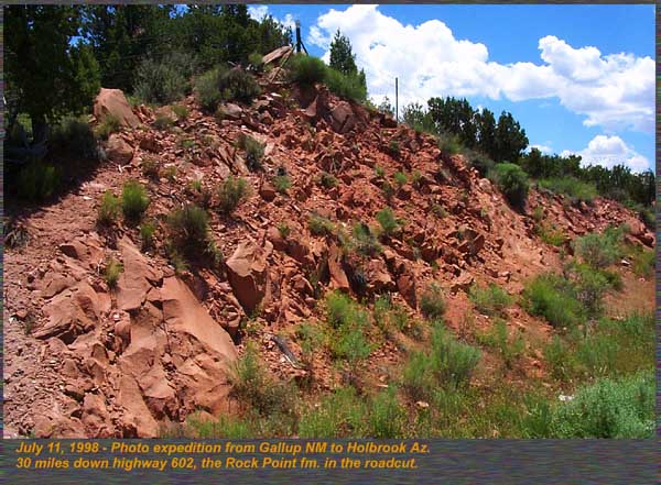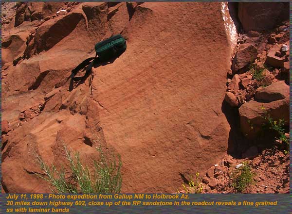 A red flagstone type unit primarily from Gallup, New Mexico to the Arizona border. Deposition environment included mud flat, and eolian sand sheet and eolian dune deposits. It is the primary tetrapod footprint unit of the Chinle as well, containing dozens of ichnofauna species whose track makers are primarily reptilian in origin. The Chinle is overlain by the Jurassic Wingate, and Entrada Sandstones. 30 miles down highway 602 from New Mexico into Arizona, the best exposures in the state of Rock Point formation can be seen. Thinly bedded sandstones that split into sheets is its primary lithology. A lower unit at the site was more massive, and formed this road cut along highway 602. The lower massive unit consisted of a fine grained orange sandstone with fine laminar bands, but no cross bedding. This is typical of deposition in a fluvial environment. Another view down highway 602 of the Rock Point, the beds were typically up to several feet in thickness and could be traced for thousands of feet. Just over into the New Mexico border, we found the Zuni Buttes composed of Rock Point sandstone were similarly bedded to those in Arizona. Also seen here in the Zuni Buttes, the same lower massive unit was found indicating the same depositional unit as in Arizona. Formations are not restricted to geographic boundaries and States, but often straddle several states. |