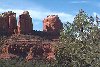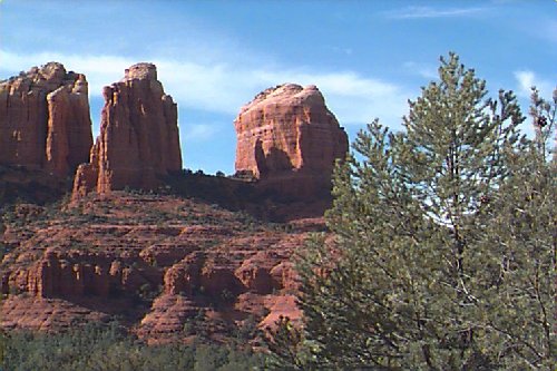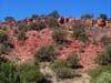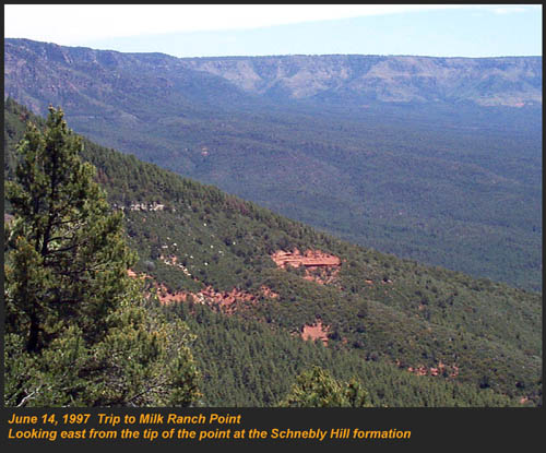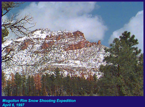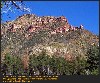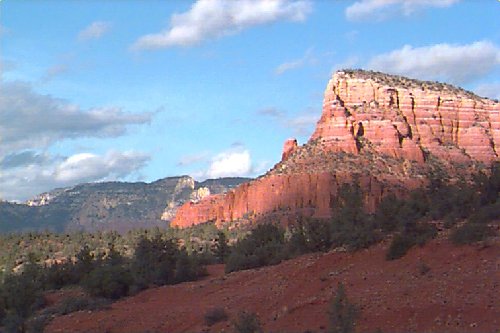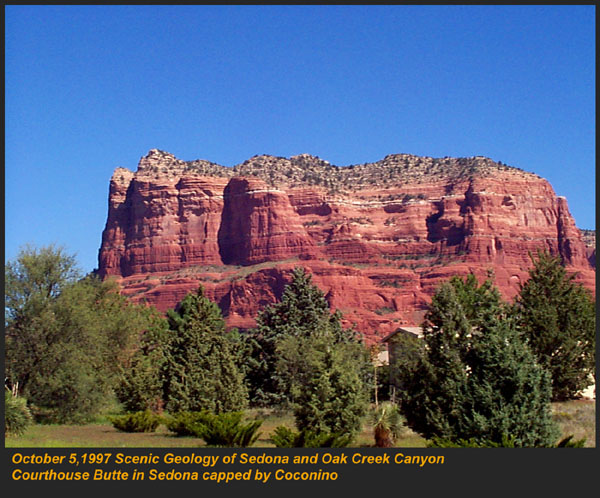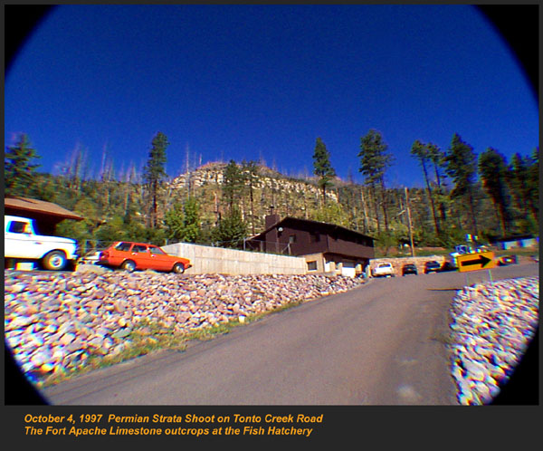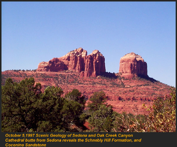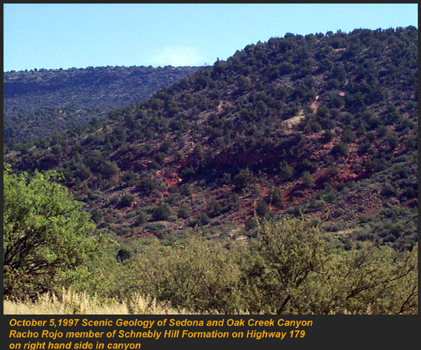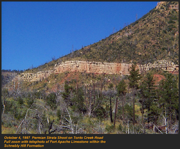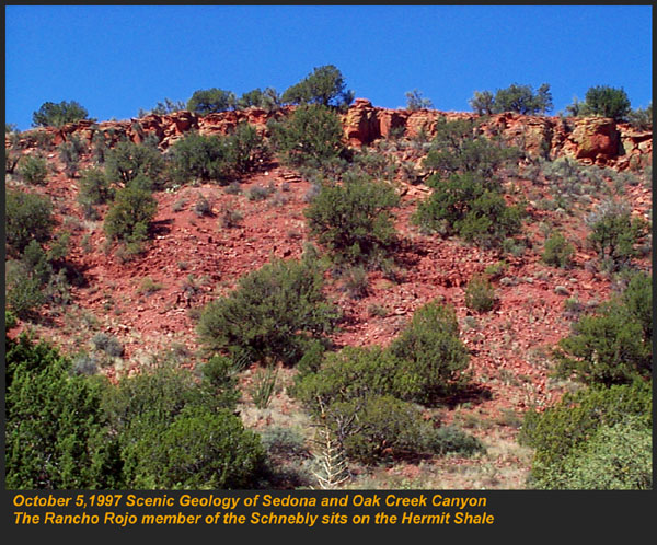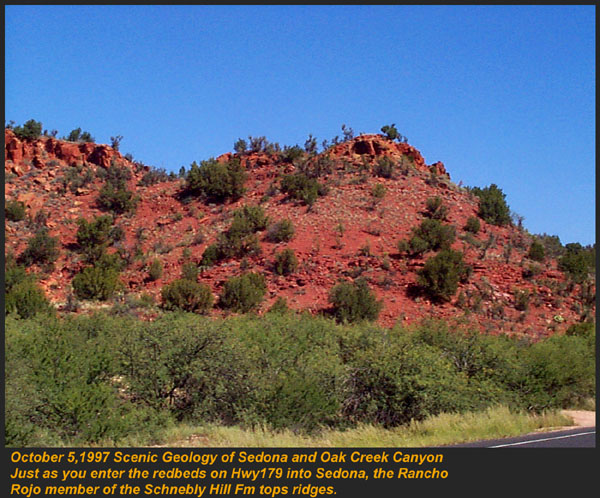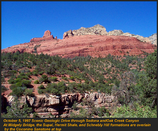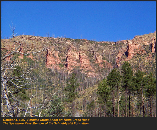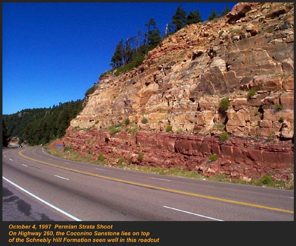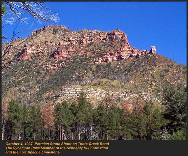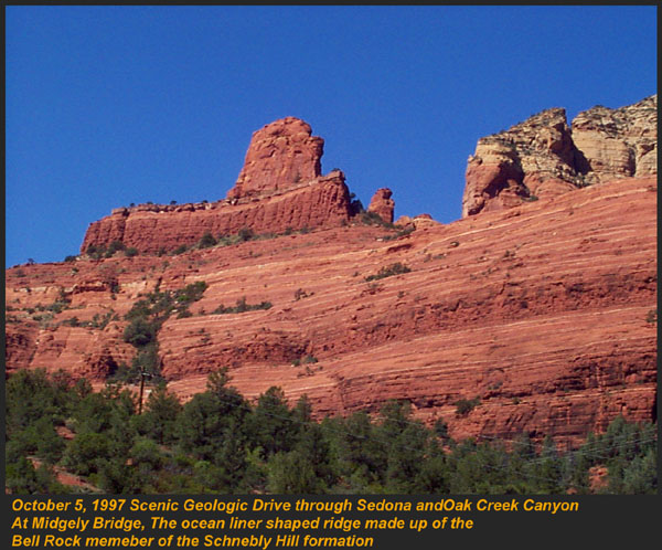 This Permian Terrestrial deposit was formed as a dune eolian deposit, and exhibits the typical cross bedding and sandy texture of such deposits. With an age of 270 - 275 million years old, several very different lithologies are represented. Fossils are very scarce in the red beds, sometimes worm burrows and plant impressions can be found. The Schnebly Hill formation is divided in two by the Fort Apache Limestone. This represents a marine transgression onto the dune fields for a short time period. The lowest member in the formation is called the Rancho Rojo member. This bright red sand wave deposit was formed when dune sands enter the marine environment by blowing wind. The resulting subsurface sand forms low rolling waves which have a unique lithology. The Rancho Rojo member can only be found near the village of Oak Creek. The next layer up is the Bell Rock member. This sandstone and siltstone deposit formed when blowing sand settled onto tidal flats on the edge of the Pedregosa Sea. The resulting layers are flat and very laminar, with occasional wave ripples on flat surfaces. Famous landmarks in Sedona Arizona such as "Bell Rock" and "Courthouse Butte" consist mainly of the Bell Rock member, with a bit of Fort Apache Limestone at the top. The Fort Apache Limestone is next in the sequence, and is covered in a separate section. Click here to go there. The final member of the Schnebly Hill formation is the Sycamore Pass member. This is the red eolian deposited sandstone that sits on top of the Fort Apache Limestone. The cross bedding and sand grain characteristics indicate that this formation is a coastal dune deposit, ranging far from the shores of the retreating Pedgregosa Sea. CLICK ON THE FOLLOWING SELECTIONS FOR A LARGER VIEW: This image, which I took from the top of the Mogollon Rim at Milk Ranch Point shows the red beds outcropping on the slope of the Rim. Just above can be seen the Permian Fort Apache Limestone, which is a deep water marine transgression onto the dune deposits. In Sedona, where we took this one, the Schnebly Hill formation can be seen weathering into magnificent columns and buttes that make the area famous for its spectacular scenery. Also taken in Sedona, this butte shows the multi-colored banding that is typical of the Schnebly Hill formation when it conformably grades into the Coconino Sandstone which overlies it. The Schnebly Hill formation north of Payson, down Tonto Creek Road. We often have heavy snows here, and the opportunity to capture the reddish brown sandstones with a dusting of snow is a real treat! Just East of the above view from the Tonto Creek area, the Schnebly Hill formation is seen here forming blocky cliffs and with a bit of angular disconformity to the more level white block wall of limestone of the Fort Apache Limestone. One of my most favorite areas to show the Permian stratigraphy is at Midgley bridge in Sedona. This shot taken from the edge of Oak Creek at the bridge, shows the Supai formation at the bottom as a massively bedded limy shale and mud stones, topped by the Hermit Formation which characteristically forms weathered slopes of very soft red shales, over this is the Bell Rock member of the Schnebly Hill formation, showing its marine tidal flat bedding. This red ridge by the way is known locally as "ship rock". The marine Fort Apache Limestone forms the base of the ships "stack". On the top, the stack itself is made of eolian deposited Sycamore Pass member of the Schnebly Hill formation. To top the view, the ridge behind is solid Coconino Sandstone! BELL ROCK MEMBER The Fort Apache Limestone is a dominant feature in the landscape in this view taken up on the Mogollon Rim near the trout fish hatchery near the town of Tonto Creek. Only about 80 feet thick here, it is non fossiliferous, and very blocky in appearance. I was not able to get very near the outcrop, because it is on private land, but the reddish Bell Rock member of the Schnebly Hill formation can be seen directly under the cliff. Bell rock, the butte that the Bell Rock member of the Schnebly Hill formation was designated as the type locality for, is one of the most photographed formations in all of Arizona. It can be easily seen that the marine tidal flat deposited shales and sandstones are perfectly flat laminations all the way up the hill. Occasional limy shale or limy sandstone beds inter layer the sandstones within the sequence. The best view of this butte is along the roadway between the village of Oak Creek, and Sedona. I am showing this close up of Ship Rock, next to the Midgley bridge in Sedona, to show the intricate and very numerous laminations in the Bell Rock Member of the Schnebly Hill formation. When examined up close, the lighter layers are more limy, and finer grained than the deep red layers. Look how thin now the Fort Apache Limestone is getting at the top of the ridge. This member eventually pinches out further down the road, marking the end of the marine transgression onto the dunes. SYCAMORE PASS MEMBER This image, also up near the fish hatchery down Tonto Creek road shows the Sycamore Pass member of the Schnebly Hill formation forming rugged cliffs and escarpments. The dune/tidal deposit has hundreds of individual layers seen here, each representing a different period of deposition cycle. The road to the Tonto Creek Fish Hatchery offers a splendid view of the Fort Apache Limestone and Sycamore Pass Member of the Schnebly Hill Formation. Here, I was at the hatchery itself, looking north. In this road cut, on Highway 260 out of Christopher Creek, the yellow Coconino sandstone is seen sitting conformably on the upper Sycamore Pass member of the Schnebly Hill sandstone. The red Schnebly here is more laminated and represents a tidal zone deposit, and the Coconino contains many more cross beds of eolian origin, indications of a change to a more arid dune type environment. Cathedral Butte, located in the center of Sedona, is a chain of buttes formed of the S