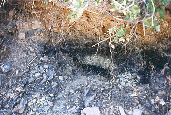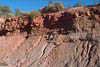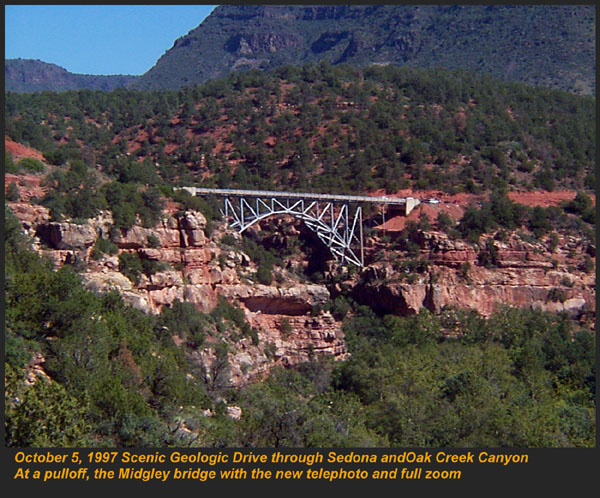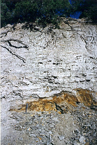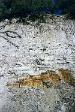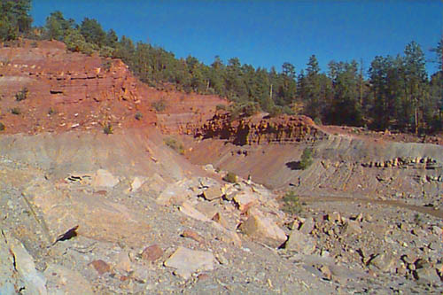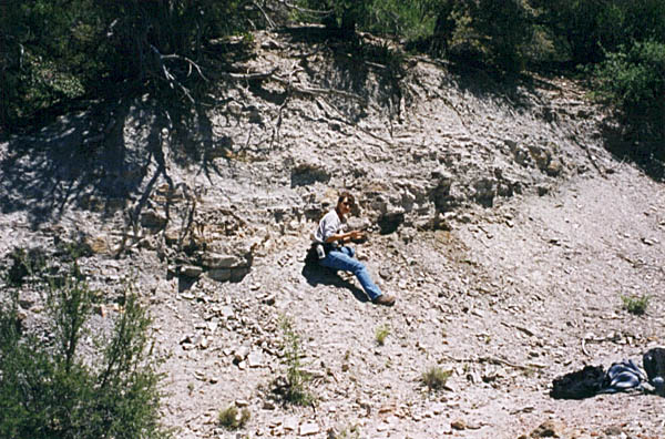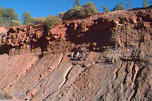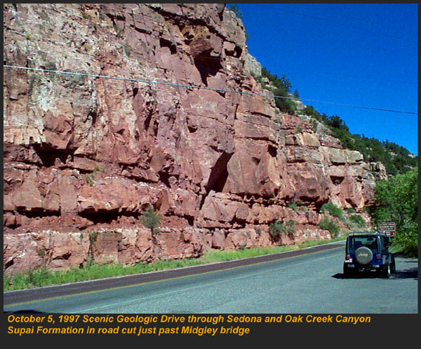 The Supai Group is a label that was used in the past to describe everything from the Hermit Shale up to the Schnebly Hill formation, and everything in between. Recently, the Hermit and Schnebly have become independent in their own right, and the term "Supai" has become much more limited. Present predominantly on the Mogollon Rim, most of the Supai group is 325 to 285 million years old. Consisting of conglomerates, mudstones, marls and limestones, the members represent a range of depositional environments from near shore tributary and brackish, to fluvial and dune type sedimentation. The Supai group crosses the Pennslyvanian - Permian boundry, and in most areas directly underlies the Hermit Formation. CLICK ON THE FOLLOWING SELECTIONS FOR A LARGER VIEW: This is the internal workings of the abandoned Christopher Creek Uranium mine. Located across from the RC boyscout camp along highway 260, this locality has been a favorite for many years to collectors of fossil plant material along the Pennsylvanian - Permian boundry. The lower light tan formation is the Supai, and it is overlain by the Hermit Formation, marked by the redbed on the top. Fossils lie in carbonized beds of coal shale within the upper Supai. Many of the large tan blocks in the forground contain impressions of bark, and calemites trunks. Here we are seen collecting plant material in the coal shale bed at the Christopher Creek Uranium mine. The Reddish layer towering above us is the Hermit Formation, and the weathering slopes below us are the Supai formaion. Typically, the remains of both Pennslyvanian and Permain carbonized plants are found, including Calemites and annularia, Walchia fronds, Pecopteris ferns, Spirorbis annelid worm shells, and much plant hash. We have also found shark coprolites and tiny bits of Permian petrified wood in portions of the quarry as well. Just above Fossil Creek, the Supai lies in grey shale beds just below the Hermit Formation. This is one of the few areas that actual coal seams can be found in this formation. Here, the grey shales contain a foot wide layer of medium grade coal, in which the upper most layers touch shales containing plant fossils. This particular coal bed was used in palnology studies (fossil pollen) back in the 50's, and only contians stems impressions. Just down the trail from the above site, another outcrop of Supai formation occurs. The basic grey carbonaceous shales are seen here, and the distinct bedding is powdery to the touch. several coal horizons appeared at this outcrop, each with a fossil plant bed in the shales above them. Here, at the same Fossil Creek outcrop seen above, the author is seen enjoying the numerous fossil plant horizons in the grey shales. The beds range from nearly massive to highly fissile in nature. It was at this site we found an unusual occurence of Permian petrified wood. Midgley Bridge in Sedona sits completely on the Supai formation. The grey shales and limestones and conglomerates that form this group have both massive and fine laminar bedding. Although we found this area devoid of fossils because of the rather coarse nature of the constituents, other areas contain excellent Permian\Pennsylvanian boundry plant fossils, including walchia, cordiates and calemites. Just on the edge of the Midgley bridge in Sedona, the bridges foundation rests completely on the grey Supai formation. We found in this area, its massive nature formed resistant cliffs and protruding plates into the canyon below. The top surface of the formation is pockmarked, and contains many pools of water after a brisk rain. Looking directly into the canyon spanned by the Midgley bridge in Sedona, the massive Supai formation, which contained much conglomeritic material is overlain by a spectacluar assemblage of other formations. To the left, the Bell Rock member of the Schnebly Hill formation, and to the right in the distance, the Coconino Sanstone also forms resistant cliffs. Just past Midgley Bridge in Sedona, you encounter a huge road cut into the Supai formation. We parked our Jeep here for scale to show the massive layers interbedded with the finer shales. If you look carefully at the base, there is virtualy no scree slope or broken material. The Supai doesn't weather very fast, and usually will break off as one huge block at a time. |