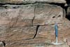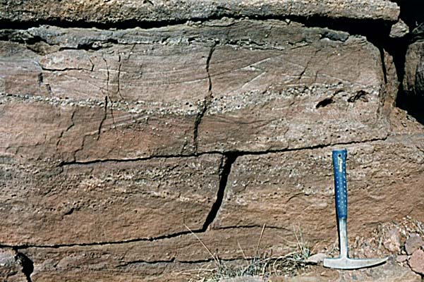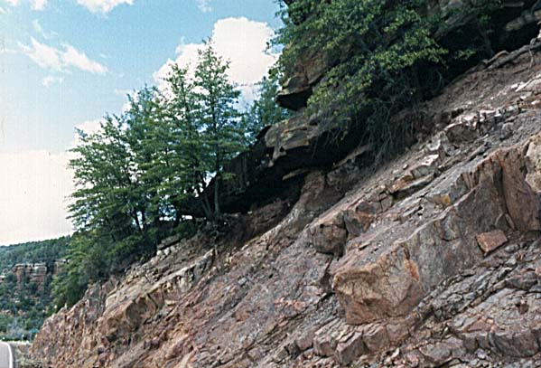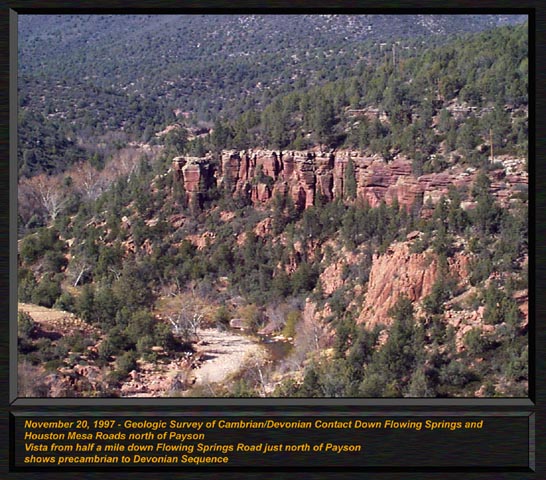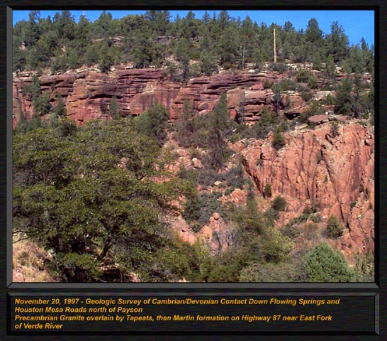 The Tapeats sandstone is lower Cambrian in age, and belongs to the Tonto Group which includes the Muav Limestone, and Bright Angel Shale found together in the Grand Canyon. However, the Tapeats alone outcrops for great distances along the base of the Mogollon Rim. Appearing as a browinish to light tan in color, it contains almost shaley sandstones up to coarse conglomerate. Much crossbedding occurs in the Tapeats, because it is a tidal marine deposit, and includes the deposits right up to the shorline, but not beach dunes or eolian deposits. The material for the Tapeats was derived from the underlying Precambrian granites and metamorphic rocks found in the region. It is easy to see how a pounding marine surf can separate out the constituents of such basement rocks, and form beach sands and highly winnowed tidal deposits. The Tapeats is between 500 and 550 My old, and contains a few diagnostic trace fossils such as Correphioides and Diplocraterion over the Mogollon Rim, and some trillobite trackways in the Grand Canyon. CLICK ON THE FOLLOWING SELECTIONS FOR A LARGER VIEW: Resting unconformably on the 2 billion year old granite, the Tapeats is seen here as a darker layer on top of the ligheter tan igneous rock at the base. This photograph was taken on Highway 87, at the crossing of the East Fork of the Verde River. Also taken at the Verde River outcrop, the overhanging Tapeats ledge seen here contained the trace fossil Skolithos, vertically burrowing worm like creatures that are index fossils to the lower Cambrian. The Tapeats here consists of very coarse to fine massive and cross bedded sandstones, with flat deposited layers from tidal deposits that contain the Skolithos. Dimples from sea anenomies have also been found here, forming in small groups. Close up of the Tapeats at the same Verde River outcrop, showing crossbedding from underwater marine dunes that are interbedded with corse flat bedded conglomerates from shore line wave deposits. This image shows the relationships over most of northern Arizona of The Precambrian through Devonian contacts. It was taken from Highway 87, and The East Fork of the Verde, just north of Payson. On the bottom, the pink 1.8 By precambrian granite forms a firm foundation for the sedimentary layers above. Lying nonconformably upon the granite is the Cambrian Tapeats Sandstone, with its lenslike lithology evident. At this location, few subareal crossbeds are present, if any, indidating a deposit that was completely within the tidal zone, complete with Skolithos trace fossils. The grey limestone ledges above the Tapeats are the Devonian Martin formation, which lies unconformably on the Tapeats. Another view from East Fork of the Verde, a closer view of the Martin on top of the Tapeats. At this boundry exactly, we have seen arthrodire plates (primitive fish) occasionally, some actually formed into the sandstones upper inch or so. This has caused much confusion over the years as to the exact age of the Tapeats, which at one point was considered Devonian on the upper most layers. But how can devonian fossils be found actually pressed into the upper layers of solid cambrian rock? Reworking is the answer. The top few inches of the Tapeats was reworked back into sand during the devonian, and some fish material was preserved in it as it relithified. Seen from Flowing Springs road, just off of Highway 87 north of the town of Payson, the grandeur of the Tapeats can be fully appreciated. Like a little grand canyon, the East Fork of the Verde cut into the surrounding rock, forming these elegant outcrops for geologists to enjoy! Note how the Devonian Martin formation, above the Tapeats quickly changes from a ledge forming limestone, to a slope forming shale above. Just down the road from the above shot, the bold cliffs of the Devonian Martin Formation lies unconformably upon the Tapeats. The arthrodire plates lie in the flat ledge just above the Tapeats, at thier contacts. |