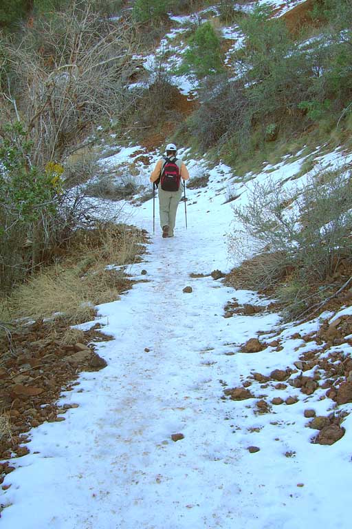 very steep. Dawn hikes ahead through the red sandstone beds of