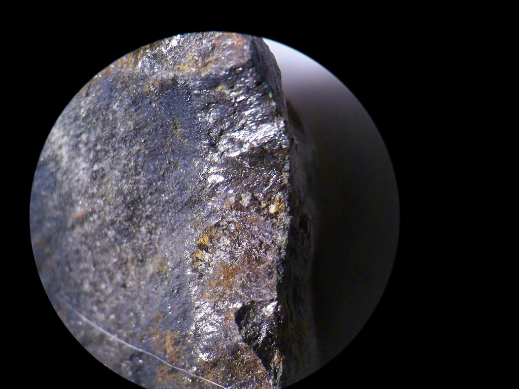 the manganese nodule split open, showing the metallic appearance. |