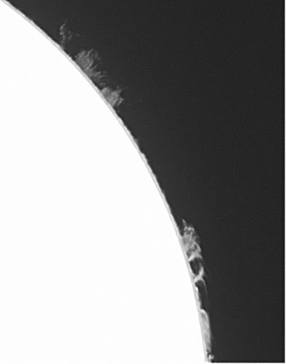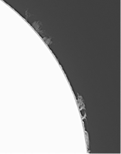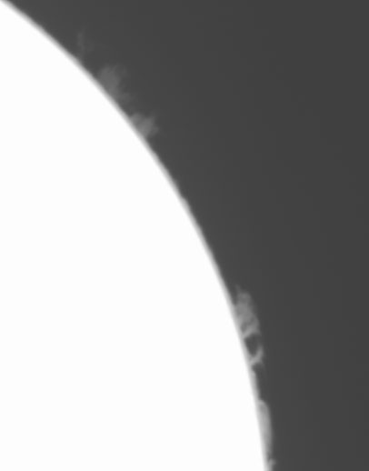 This image is a crop from a full frame with an Imaging Source DMK camera of the solar limb in Halpha Light. This is the result of a raw stack of about 300 of the sharpest images out of 1200 selected automatically in Registax 6. No wavelets have been applied yet. Although the disk is necessarily overexposed, the proms and spicules are not. Here are three processed images with wavelets. The radius of the sharpening is always 1 pixel, but the amount varies by a factor of three: