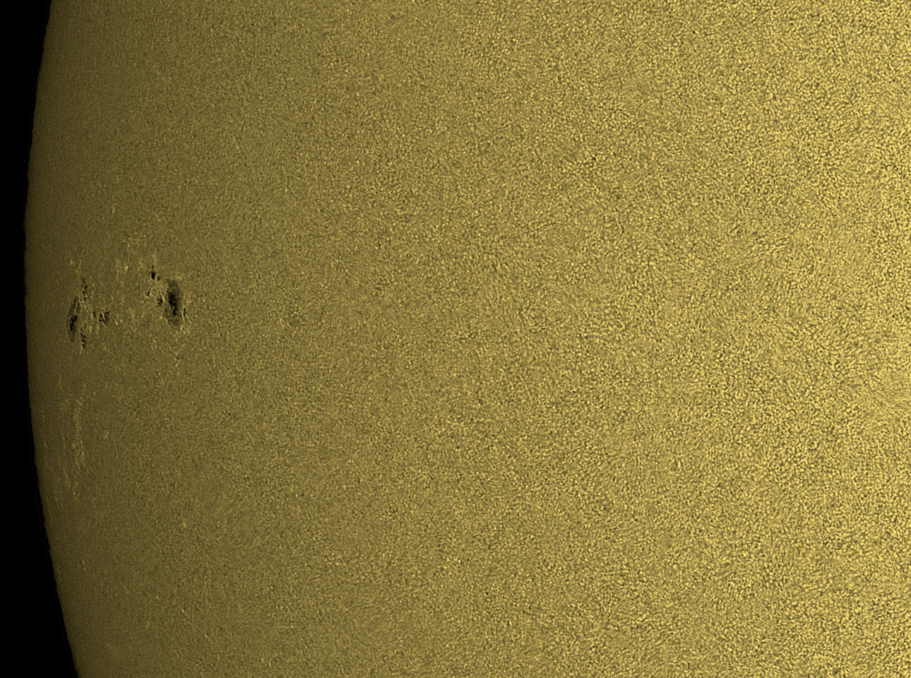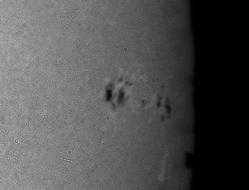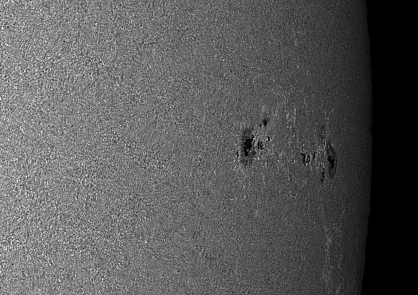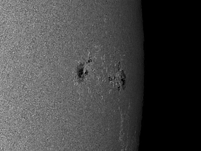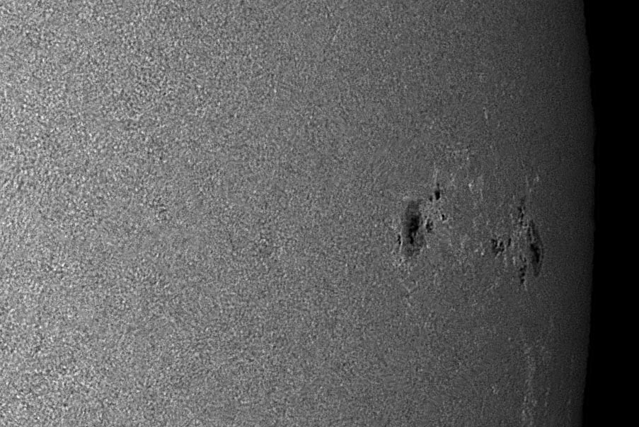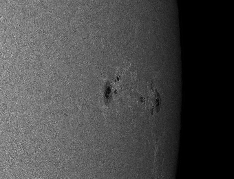 Most of the time, solar imagers are faced with less than optimal seeing and must back off on the magnification of the projected image on to the CCD/CMOS sensor. When the seeing is really bad, most of the time we are shooting only a full disk shot, or not at all. To help improve the odds of getting the best image possible on any given seeing situation, we constructed a series of aperture stops made from foam board, with hole sizes ranging from one inch to 5 inches, and of course - full aperture with no stop is six inches. On a clear Saturday morning the seeing was very poor - 1/5 where 1 is very bad and 5 is perfectly still, we tested the stops with the 2.5x Televue Powermate Barlow to determine the effect it would have on the highly magnified images. If the seeing was perfect, one would expect that as the aperture is increased, the resolution will go up, and the sharpest image would be with the six inch full aperture. However if the seeing is poor, the seeing cells in the upper atmosphere would determine the optimal size of the aperture for sharpest image. In practice, this is what occurred and on this mornings 1/5 seeing, the four inch size was the sharpest. For this test, the brightness was adjusted after the stop was installed to yield the identical histogram when the original AVI files were recorded. Below is the images from this test. They are cropped to half frame size so you can see the effects more clearly, all images were automatically processed in AVIStack, and the exact same amount of wavelet processing was performed on each in Registax. In Photoshop, the brightness of each image was made similar and rescaled to the posting size here.