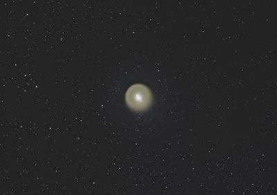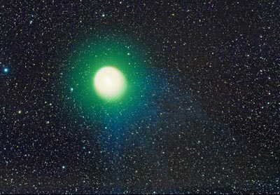 This 3 degree field demonstrates the comets rapid expansion since the explosion on October 24th. Taken at our pristine dark site up at Happy Jack, both long and short exposures were required to reveal the comets superb details. The left image is a combined 31 minutes tracked on the comets nucleus, and thus shows short star trails. The core was still extremely bright at 2.8 magnitude, and had easily visible expanding shells as seen here in the 11x80 binoculars. The comets nucleus (single) is just to the upper left of the central coma. On the right is a much deeper image and reveals the extended green coma, and fan like blue ion tail. The tail was not seen in the binoculars, but the outer halo was.