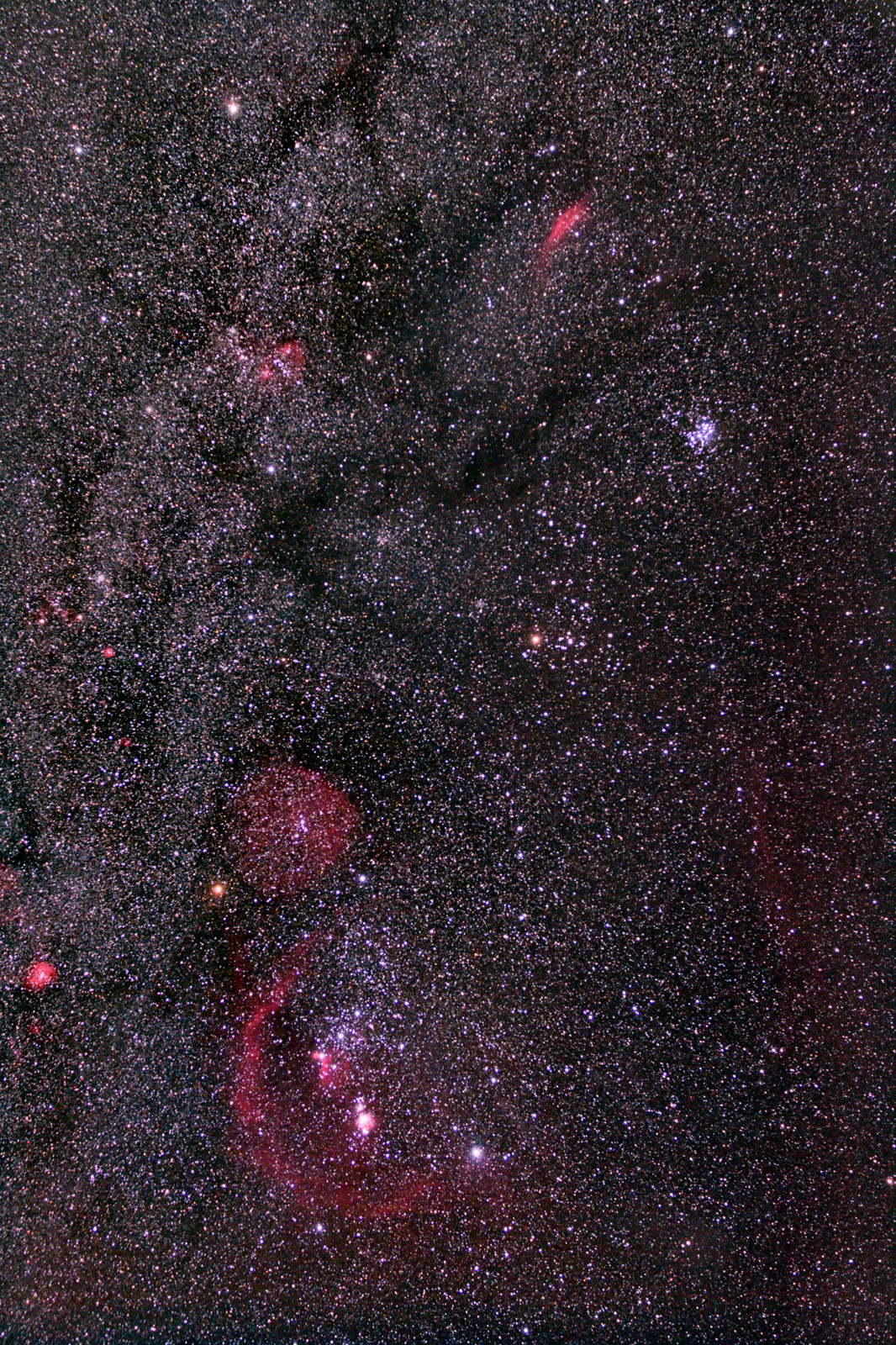Instrument: Canon 17 - 40mm L at 17mm f/4.5 Platform: Astrophysics 1200 QMD/Piggyback on 12.5" Camera: Hutech Modified Canon XTi @ ISO800 Exposure: 130m (13 x 10m) Filters: Lumicon Halpha Pass Location: Payson, Arizona Elevation: 5150 ft. Sky: Seeing 5/10, Transparency 7/10 Outside Temperature: 30F Processing Tools: Photoshop CS2, Maxim DL, Canon RAW HOME GALAXIES EMISSION NEBS REFLECTION NEBS COMETS GLOBULARS OPEN CLUST PLANETARIES LINKS